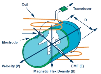 電磁流量計的工作原理基于法拉第電磁感應定律。根據(jù)法拉第定律,當導電流體流經(jīng)傳感器的磁場時,電極之間就會產(chǎn)生與體積流量成正比的電動勢,其方向與流向和磁場垂直。電動勢幅度可表示為:E = kBDv