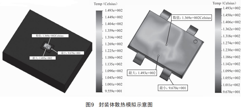 仿真結(jié)果與分析:通過對上述模型進(jìn)行熱仿真分析,設(shè)定空氣自然對流條件下,獲得產(chǎn)品內(nèi)部的熱量分布情況以及晶片結(jié)面溫度Tj=143.9C,黑膠表面的平均溫度Tc=132.6C,如圖9和圖10所示。