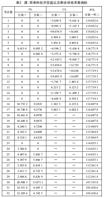 進(jìn)一步地,本文評(píng)估了各負(fù)荷、電源單元的經(jīng)濟(jì)效益以及剩余供給系數(shù)指標(biāo),結(jié)果如表2所示。