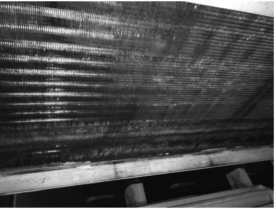 該車組入庫檢修期間,在打開空調(diào)檢修蓋板時發(fā)現(xiàn)為蒸發(fā)器1外表結(jié)冰(圖2),后續(xù)處理為更換蒸發(fā)器,更換蒸發(fā)器后該空調(diào)功能正常。