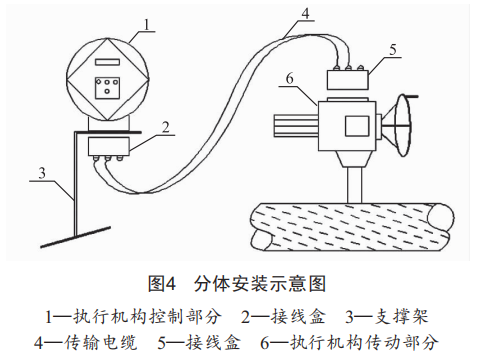 (2)中壓供熱壓力調(diào)節(jié)閥的電動(dòng)執(zhí)行機(jī)構(gòu)為一體化安裝形式,根據(jù)其結(jié)構(gòu)功能不同可將執(zhí)行機(jī)構(gòu)分為控制部分和傳動(dòng)部分,現(xiàn)將控制部分與傳動(dòng)部分分離,其中傳動(dòng)部分繼續(xù)與閥門保持正常連接,在蒸汽管道旁的地面上設(shè)置支撐架,將控制部分安裝于相對(duì)靜止的支撐架上,通過(guò)傳輸電纜將控制部分與傳動(dòng)部分相連,這樣就可以避免電動(dòng)執(zhí)行機(jī)構(gòu)的電位器等零部件因管道大幅振動(dòng)受損進(jìn)而影響執(zhí)行機(jī)構(gòu)的正??刂?。經(jīng)過(guò)分體改造后的安裝情況如圖4所示。執(zhí)行機(jī)構(gòu)經(jīng)分體式改造后既能保證控制部分的相對(duì)獨(dú)立,又能使整個(gè)執(zhí)行機(jī)構(gòu)繼續(xù)正常地受控和動(dòng)作,不失整體性,又增強(qiáng)了穩(wěn)定性。