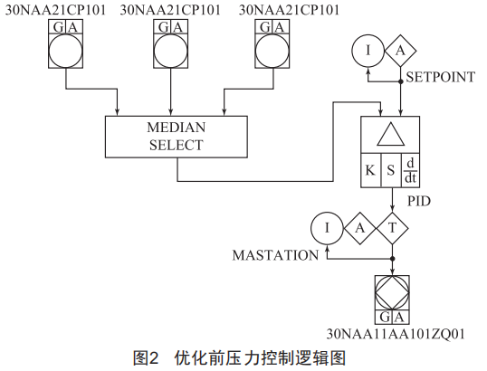(l)可門公司供熱壓力控制系統(tǒng)采用出口壓力作為被控參數(shù),是單純的反饋閉環(huán)自動(dòng)控制系統(tǒng),壓力調(diào)節(jié)控制邏輯如圖2所示。主要熱用戶是一家大型化工廠,由于其生產(chǎn)工藝流程的特殊性,該用戶對(duì)熱需求量瞬時(shí)變化較大,lmin內(nèi)的最多升降可達(dá)60t/h。當(dāng)熱用戶需求量瞬間增大時(shí),供熱蒸汽流量迅速增加,供熱壓力調(diào)節(jié)閥無(wú)法及時(shí)開啟會(huì)導(dǎo)致蒸汽管道壓力快速降低,供熱壓力不足:供熱壓力調(diào)節(jié)閥開大調(diào)壓時(shí),熱用戶需求量開始大幅降低,供熱蒸汽流量隨之減少,調(diào)節(jié)閥無(wú)法快速做出響應(yīng),會(huì)導(dǎo)致供熱超壓。因此,頻繁大幅變化的供熱流量作為一個(gè)主要干擾因素影響了中壓供熱系統(tǒng)的壓力控制。
