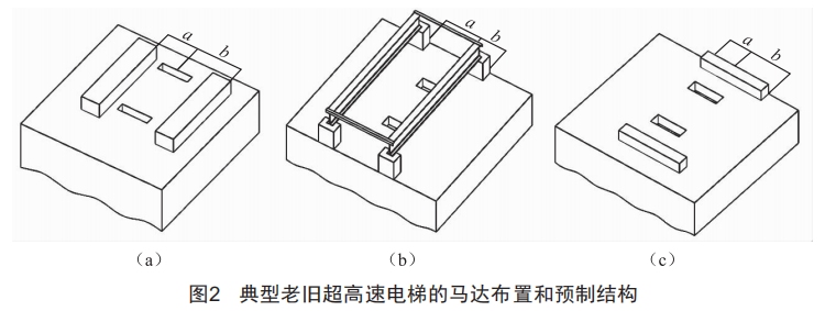 下面我們來看看幾種典型老舊超高速電梯的馬達(dá)布置和預(yù)制結(jié)構(gòu),如圖2所示。
