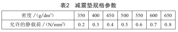式中,p為允許的靜載荷(N/mm2),參考項(xiàng)目中選用0.6N/mm2:A為減震墊的面積(mm2)。