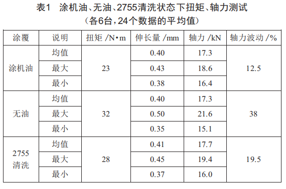 選取和實際生產(chǎn)條件接近的涂機(jī)油、無油和2755清洗螺栓進(jìn)行裝配驗證。