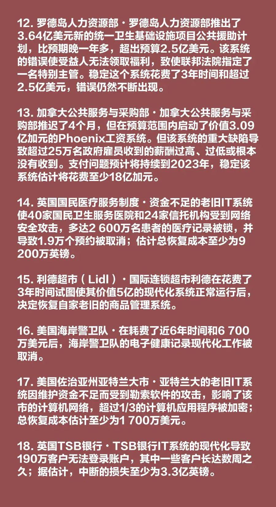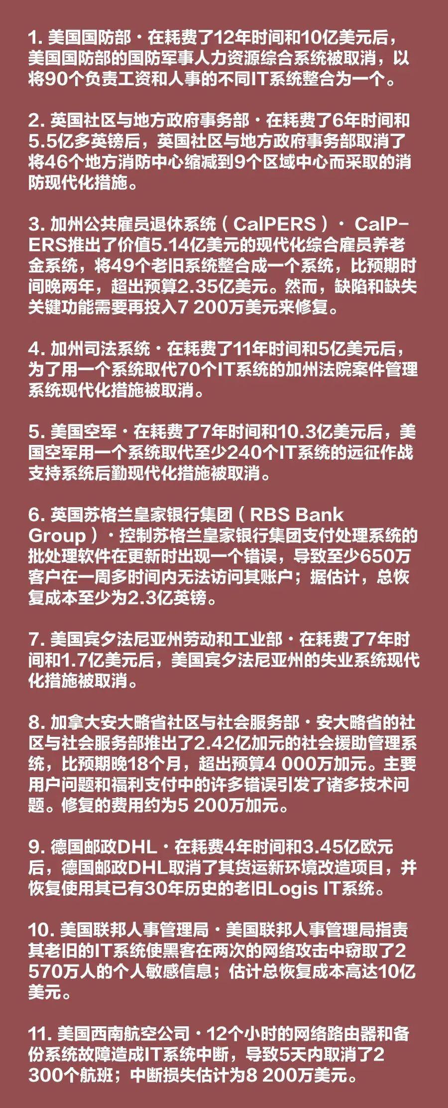 自2010年以來,全世界的企業(yè)和政府在IT產(chǎn)品和服務(wù)上的支出估計為35萬億美元。其中約3/4用于運營和維護現(xiàn)有IT系統(tǒng)。至少有2.5萬億美元用于更換老舊的IT系統(tǒng),其中約7200億美元由于更換失敗而被浪費。但令人驚訝的是,人們很少注意到這些IT系統(tǒng),即使公司和公共機構(gòu)每年都會在這些系統(tǒng)上花費數(shù)千億美元。從起床到睡覺,我們常常不知不覺地與幾十個IT系統(tǒng)互動。在我們跳入載有嵌入處理器的汽車時,聲控數(shù)字助理會為我們讀新聞,有些處理器可以幫助我們開車,還有一些處理器則可為我們提供娛樂,讓我們享用機器人煮的咖啡。污水處理廠、電網(wǎng)、空中交通管制、電信服務(wù)和政府行政管理等基礎(chǔ)設(shè)施都依賴于數(shù)十萬個看不見的IT系統(tǒng),這些IT系統(tǒng)構(gòu)成了另一個隱藏的基礎(chǔ)設(shè)施。商業(yè)組織依靠IT系統(tǒng)來管理工資單、訂購物品和核準(zhǔn)無現(xiàn)金銷售,這只是現(xiàn)代經(jīng)濟平穩(wěn)運行所必需的數(shù)千項自動化任務(wù)中的區(qū)區(qū)3項。盡管這些系統(tǒng)幾乎涉及我們生活的方方面面,但我們從來沒有再考慮過它們,因為在大多數(shù)情況下,它們都在正常運行。我們甚至沒有想到,IT需要持續(xù)關(guān)注才可以保證工作秩序。英國歷史學(xué)家大衛(wèi)?艾杰頓(David Edger-ton)在其具有里程碑意義的研究《歷史的震撼:1900年之后的技術(shù)與全球歷史》(The Shock of the Old: Technology and Global History since 1900,牛津大學(xué)出版社,2007年)一書中表示,盡管維護和維修是我們與技術(shù)關(guān)系的核心,但它們是“我們不愿考慮的事情”。因此,技術(shù)維護“一直存在于一個朦朧的世界里,在由它們組成的社會中,幾乎看不到它們的身影”。事實上,老舊IT系統(tǒng)的隱形性恰恰證明了這些系統(tǒng)非常成功。當(dāng)然,它們出現(xiàn)故障時則不然。“老舊系統(tǒng)”沒有正式的定義,但通常被理解為關(guān)鍵系統(tǒng)在某種程度上已經(jīng)過時。它可能無法支持未來的業(yè)務(wù)運營;應(yīng)用程序、操作系統(tǒng)或硬件的供應(yīng)商可能不再營業(yè)或不再支持其產(chǎn)品;系統(tǒng)架構(gòu)可能較為脆弱或復(fù)雜,不適合升級或修復(fù);或者人們無法再去了解系統(tǒng)工作的細(xì)節(jié)。