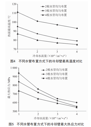圖4~5中,冷卻水管數(shù)均是從2根增加到4根,冷卻水流量為1×10-3m3/s時(shí),冷卻壁最高溫度從111℃減小到87℃,降幅為22%,最大熱應(yīng)力從940MMP減小到736MMP,降幅為22%:冷卻水流量為2×10-3m3/s時(shí),冷卻壁最高溫度從101℃減小到80℃,降幅為21%,最大熱應(yīng)力從756MMP減小到644MMP,降幅為15%:冷卻水流量為3×10-3m3/s時(shí),冷卻壁最高溫度從97℃減小到77℃,降幅為21%,最大熱應(yīng)力從644MMP減小到592MMP,降幅為8%:冷卻水流量為4×10-3m3/s時(shí),冷卻壁最高溫度從93℃減小到75℃,降幅為19%,最大熱應(yīng)力從600MMP減小到544MMP,降幅為9%。同等冷卻水流量下,隨水管數(shù)的增加,冷卻壁最高溫度和最大熱應(yīng)力顯著減小,這是由于增加冷卻水管數(shù)可以增加冷卻水與壁體的總接觸面積,從而增強(qiáng)冷卻效果。