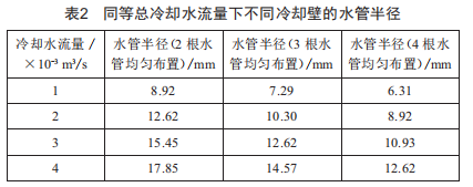設(shè)定冷卻壁的冷卻水流量取值范圍為1×10-3~4×10-3m3/s,計(jì)算同等總冷卻水流量下不同冷卻壁的水管半徑,如表2所示。