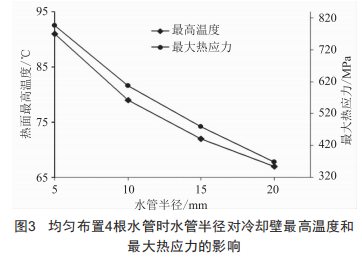 (1)冷卻壁最高溫度和最大熱應(yīng)力隨水管半徑的增加顯著減小,但水管半徑的增大會(huì)使冷卻水流量大幅增加,造成較大的經(jīng)濟(jì)損失,且冷卻水管半徑過大會(huì)造成冷卻壁機(jī)械強(qiáng)度降低。