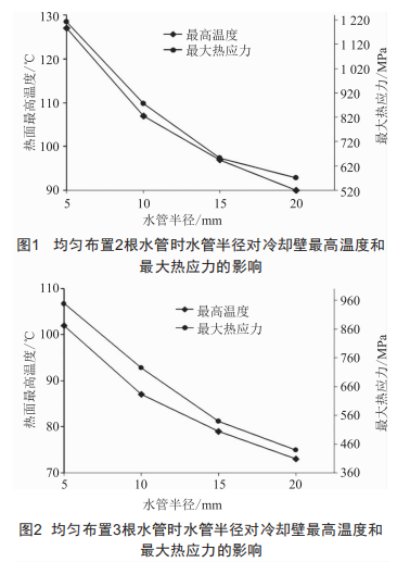 圖1~3中,水管半徑均是從5mm增加到20mm,冷卻壁內(nèi)均勻布置2根水管時(shí),冷卻壁最高溫度從127℃減小到90℃,降幅為29%,最大熱應(yīng)力從1212MPa減小到572MPa,降幅為53%:均勻布置3根水管時(shí),冷卻壁最高溫度從102℃減小到73℃,降幅為28%,最大熱應(yīng)力從948MPa減小到440MPa,降幅為54%:均勻布置4根水管時(shí),冷卻壁最高溫度從91℃減小到67℃,降幅為26%,最大熱應(yīng)力從796MPa減小到368MPa,降幅為54%。隨水管半徑的增加,冷卻壁最高溫度和最大熱應(yīng)力顯著減小,但水管半徑的增大會(huì)使冷卻水流量大幅增加,水管半徑從5mm增加到20mm,冷卻水流量增長(zhǎng)15倍,這就造成了較大的經(jīng)濟(jì)損失,且冷卻水管半徑過大會(huì)造成冷卻壁機(jī)械強(qiáng)度降低。通過增加冷卻水管數(shù)可以增加冷卻水管內(nèi)表面與冷卻水的接觸面積,實(shí)現(xiàn)在較小的冷卻水流量下獲得更好的冷卻效果。為了更加直觀地說明這一點(diǎn),本文計(jì)算了同等冷卻水流量下分別布置不同水管數(shù)時(shí)的冷卻壁最高溫度和最大熱應(yīng)力,并做了對(duì)比分析。