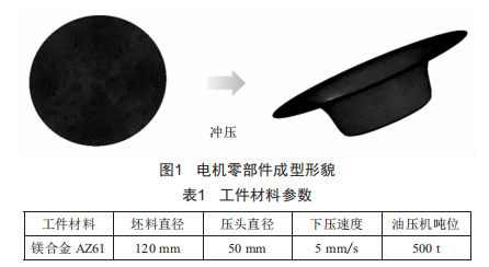 圖1展示了某電機(jī)整體裝配零部件沖壓成型工藝過程,存在相對復(fù)雜的壓邊力,有相應(yīng)研究價值及拉伸難度,本文以此零件進(jìn)行CAE成型分析與說明,工件材料參數(shù)如表1所示。