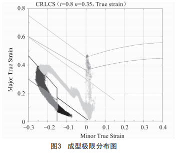 CAE分析結(jié)果如圖2、圖3所示,其中,圖2是成型形貌分布,可以直觀地看出裂紋可能的發(fā)展位置與趨勢:圖3是成型極限的數(shù)值分布,可以顯示出具體的成型不良區(qū)域的數(shù)值大小。