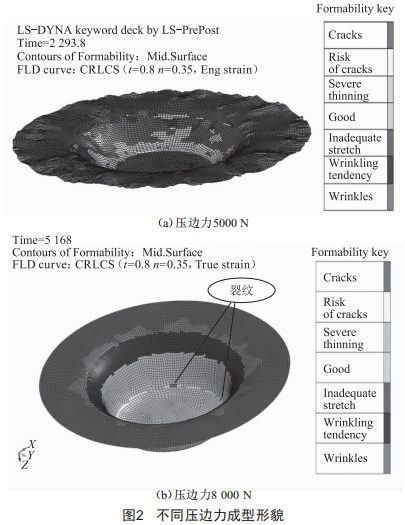 壓邊力合適時,既能夠很好地抑制翹曲起皺,又能夠讓材料很好地流動到?jīng)_壓件的底部,成型極限達(dá)到25mm的深度。