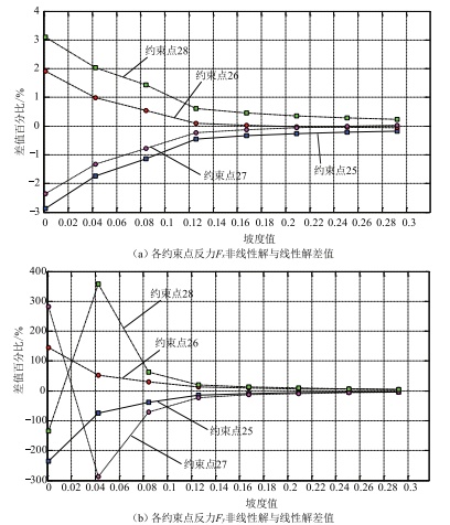 (1)主材內(nèi)力及基礎(chǔ)力,對于常規(guī)鐵塔(坡度比在0.08~0.3之間),非線性計算值比線性計算值增大幅度約1%,可以不考慮非線性效應(yīng):對于窄基塔(坡度比小于0.08),隨著根開的減少,差值呈放大趨勢,當根開與邊坡處相同時,最大增大幅度為4%,對于受力較小的塔,也可忽略不計,但是對于受力較大的塔,工程設(shè)計中應(yīng)考慮非線性效應(yīng),留有相應(yīng)的裕度。