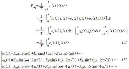 為增加電機(jī)的輸出功率,相位和相電流諧波的相電壓應(yīng)該是同步的。否則,兩者的乘積甚至?xí)a(chǎn)生負(fù)值,并且平均功率不能最大化。因此,令on取零,平均功率計(jì)算公式如式(7)所示: