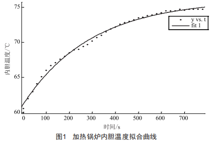 由機理建模所得數(shù)學模型,我們可以假設對象的傳遞函數(shù)為一階,利用MATLAB仿真軟件的線擬合工具箱對所采集到的數(shù)據(jù)進行線性擬合,得到輸出溫度擬合曲線如圖1所示。
