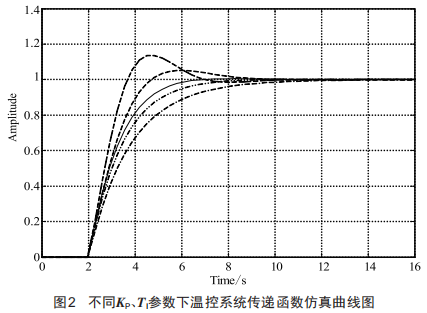 得到系統(tǒng)的數(shù)學模型之后,就可以完成PID調(diào)節(jié)器參數(shù)的整定,該溫控系統(tǒng)主要是對比例參數(shù)KP、積分時間常數(shù)TI這兩個參數(shù)的調(diào)整。根據(jù)所得傳遞函數(shù)選擇若干組KP、TI參數(shù)值,通過MATLAB仿真,比較各組參數(shù)下仿真曲線響應速度及超調(diào)量,如圖2所示。