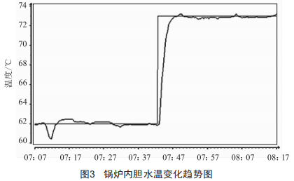 由圖2可知,實線所對應的KP、TI參數(shù)值對該模型下的控制效果較好,因此,將該組數(shù)據(jù)作為實驗溫控系統(tǒng)PID參數(shù)整定的初始值,在實驗中,將內(nèi)膽水溫設定值由62℃變化至73℃時,由組態(tài)界面觀測內(nèi)膽水溫變化曲線如圖3所示。