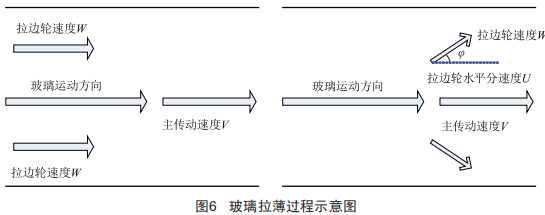 玻璃承受的拉力Fc(V一W),當W減小,則拉力F相應(yīng)提高,玻璃厚度減小,W和玻璃厚度呈現(xiàn)出正比例的關(guān)系:而當增大拉邊機角度。時,玻璃厚度變薄。