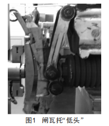正常情況下,在制動緩解時,閘瓦托可以繞著其較接點(螺桿套筒)旋轉(zhuǎn),以適應(yīng)在不同制動位置時閘瓦與車輪踏面的貼合度。在實際運行中發(fā)現(xiàn),閘瓦托不能繞較接點轉(zhuǎn)動,閘瓦托角度明顯與車輪踏面不匹配,即產(chǎn)生閘瓦托上端間隙小、下端間隙大的"低頭"現(xiàn)象,如圖1所示。