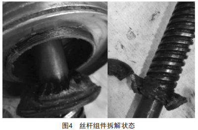 閘瓦間隙手動調(diào)整功能主要是通過圖3的絲桿組件實現(xiàn),將故障件的絲桿組件拆解,發(fā)現(xiàn)緊定螺釘及絲桿齒座均已斷裂,絲桿齒座從調(diào)節(jié)螺母的內(nèi)螺紋中旋出8mm,螺紋處未見螺紋膠,如圖4所示。該距離已遠(yuǎn)大于端面齒嚙合高度,致使端面齒脫離,所以手動調(diào)整時沒有端面齒的嚙合聲。因緊定螺釘及絲桿齒座均已斷裂,手動調(diào)整轉(zhuǎn)動調(diào)節(jié)螺母時,作用力并不能傳遞至絲桿,此時只是調(diào)節(jié)螺母獨自轉(zhuǎn)動,而內(nèi)部的絲桿并未轉(zhuǎn)動,所以不能帶動閘瓦托貼近或遠(yuǎn)離車輪踏面,閘瓦間隙手動調(diào)整功能失效。