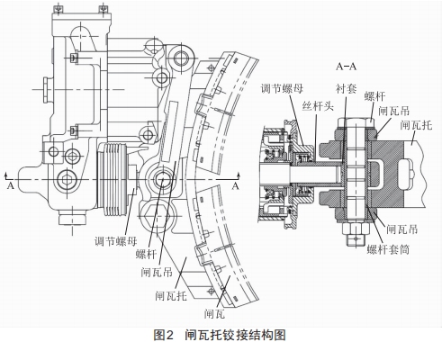 如圖2所示,閘瓦托與絲桿頭中間開孔,穿入螺桿套筒連接,閘瓦吊左右共設(shè)置兩個叉臂,叉臂中間設(shè)孔,叉臂插入閘瓦托兩側(cè)端面對準(zhǔn)孔后,螺桿依次穿過閘瓦吊一側(cè)叉臂孔、螺桿套筒內(nèi)孔、閘瓦吊另一側(cè)叉臂孔,完成三者較接。閘瓦托內(nèi)孔大于螺桿套筒外徑,二者間隙配合,閘瓦托寬度小于螺桿套筒長度,即安裝后螺桿套筒伸出閘瓦托左右端面,閘瓦吊2叉臂間寬度大于閘瓦托寬度。以上設(shè)計使得閘瓦吊2叉臂內(nèi)側(cè)實際上是與螺桿套筒左右端面頂住壓緊,閘瓦托旋轉(zhuǎn)自由度未受限,閘瓦托可繞著較接點(螺桿套筒)自由轉(zhuǎn)動,使得閘瓦角度始終與車輪踏面匹配,閘瓦能均勻磨耗,延長使用壽命。