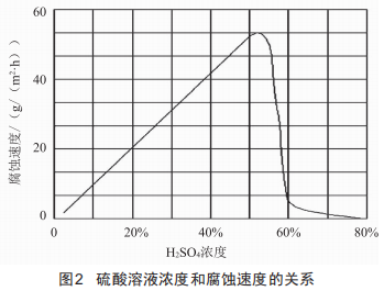 圖2表示硫酸溶液濃度和腐蝕速度的關系,硫酸濃度為50%左右時(金屬壁溫保持不變),對鋼材的腐蝕速度最快。如果硫酸較稀,它的腐蝕速度隨濃度的增加而增大,當濃度增加到40%~50%時,腐蝕最強烈:而當硫酸濃度超過56%時,腐蝕速度急劇下降。