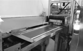 對(duì)于藥盒收集,把原來的平面自動(dòng)堆積改為輸送帶低速緩慢收集,合格的藥盒在水平下落后,直接落在一低速運(yùn)行的水平輸送帶上,即使下落時(shí)不規(guī)則的也會(huì)在向后運(yùn)動(dòng)的過程中依靠輸送帶的輕微摩擦力實(shí)現(xiàn)自動(dòng)校正,這樣可以保證藥盒方便有效地收集。具體就是在分頁機(jī)末端下方增加水平輸送帶,長度1m,輸送帶由60w三相電機(jī)帶動(dòng),通過單相變頻器控制,在輸送帶的末端增加不銹鋼斜面,斜面下方加裝啟動(dòng)和停止按鈕。斜面除了起到加裝按鈕的作用外,還可以防止藥盒下落完成后的推擠疊加,起到了很好的收集效果。其結(jié)構(gòu)如圖1所示。