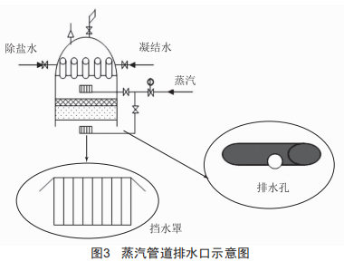 如圖3所示,經(jīng)研究,在除氧器內(nèi)部蒸汽管道最低端開直徑30mm的排水口,開孔過大會(huì)使水面蒸汽壓力升高,過小則會(huì)導(dǎo)致排水不徹底。另外,蒸汽管道出口加裝擋水罩,消除管道內(nèi)積水,防止下落的凝結(jié)水進(jìn)入蒸汽管道。