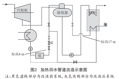 如圖2所示,重新布置鍋爐尾部加熱回水管道,從加熱器出口直接引至除氧塔頭進(jìn)水口,消除管道死角,便于管道內(nèi)氣體及時(shí)排除。