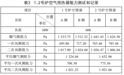 在600MW負荷下鍋爐穩(wěn)定運行時,分別對1、2號鍋爐空氣預(yù)熱器進、出口煙道的靜壓差進行測試,得到煙氣側(cè)阻力:同時記錄表盤顯示的空氣預(yù)熱器一次風和二次風之間的壓差,得到空氣側(cè)阻力,測試結(jié)果如表3所示。