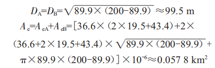 由于建筑物中間有個(gè)空中花園,導(dǎo)致整幢建筑高度不一,現(xiàn)將建筑南北兩棟樓分別標(biāo)稱為A樓、B樓,中間連接部分標(biāo)為C,但其擴(kuò)大寬度遠(yuǎn)小于A、B兩樓的擴(kuò)大寬度,故其等效面積已經(jīng)涵蓋在A、B兩樓的等效覆蓋面積內(nèi)。因此,恒豐國(guó)際廣場(chǎng)大樓的等效面積為A、B兩樓疊加后的等效面積。