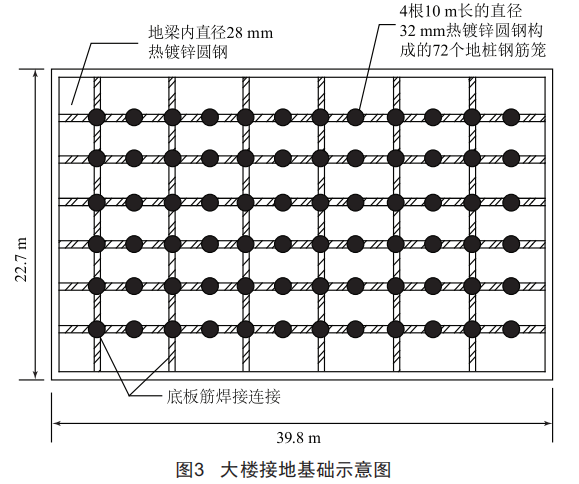 考慮到實(shí)際的施工問(wèn)題,恒豐國(guó)際廣場(chǎng)大樓每棟樓的接地裝置間隔性地選用其中的72根基礎(chǔ)樁作為接地極。在施工時(shí),將每根樁內(nèi)周圈均勻分布的4根鋼筋焊接連接并與底板筋相焊接,為使鋼筋的電氣貫通性達(dá)到最佳效果,將底板筋焊接連接·圖3)。