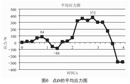 圖6為起皺嚴(yán)重點(diǎn)D的平均應(yīng)力圖,其中橫坐標(biāo)為時(shí)間,縱坐標(biāo)為平均應(yīng)力大小。從仿真動(dòng)圖可以得出從第六幀到第十六幀為起皺嚴(yán)重的時(shí)間區(qū)域,即圖6中0.5~3s。第六幀時(shí),D點(diǎn)的平均應(yīng)力為84N,隨后開始減少并反方向增大,至第九幀時(shí)為-88N,再減少并反向一直增大,至第十六幀時(shí)為372N。