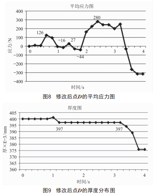 在不改變前面生產(chǎn)工序的前提下,通過(guò)改變凸模表面與板料接觸的摩擦系數(shù),危險(xiǎn)斷裂點(diǎn)D在拉伸危險(xiǎn)時(shí)間段內(nèi)的應(yīng)力絕對(duì)值最小值由11N減少到4N,絕對(duì)值最大值由372N減少到280N,選點(diǎn)絕對(duì)值總值由1744N減少到1374N,由此可知,其應(yīng)力有一定程度的降低。