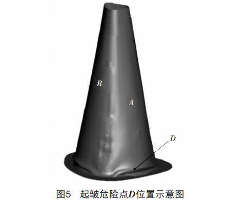 深究其原因,由于A、B、C三個(gè)面組成圓的曲率半徑比凸模外圈的曲率半徑小,而A、B、C三個(gè)面分界的三條邊組成圓的曲率半徑比凸模外圈的曲率半徑大,造成拉伸過(guò)程中三面被往外頂,三線往內(nèi)收縮,且板料平面為非中心對(duì)稱圖形,拉伸過(guò)程中板料與凸模幾何形狀不匹配導(dǎo)致受力不均勻,在半徑較小的部位開始起皺。拉伸過(guò)程中,其起皺的部分在徑向拉應(yīng)力的作用下,就會(huì)存在斷裂的風(fēng)險(xiǎn),其中起皺一平滑階段的斷裂風(fēng)險(xiǎn)比平滑一起皺階段的斷裂風(fēng)險(xiǎn)還要大。取起皺危險(xiǎn)區(qū)域的一點(diǎn)D作深入分析,點(diǎn)D位置如圖5所示。