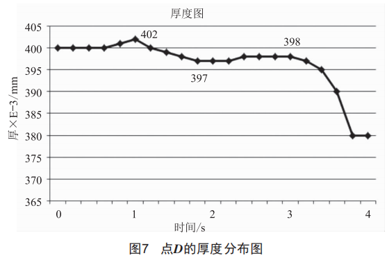 圖7為點(diǎn)D的厚度分布圖,其中橫坐標(biāo)為時(shí)間,縱坐標(biāo)為厚度數(shù)值。圖中0.5~3s內(nèi)厚度從1s的0.402mm減少到1.8s的0.397mm,然后增加到3s的0.398mm??梢钥吹贸鐾鼓F胀Σ料禂?shù)下點(diǎn)D在危險(xiǎn)時(shí)間段內(nèi)的厚度變化有一定的波動(dòng)。