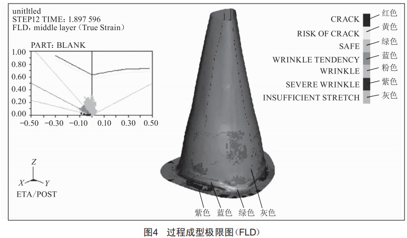 由成型極限圖可以看到板料的成型極限變化,圖4中縱坐標(biāo)表示主應(yīng)變,橫坐標(biāo)表示次應(yīng)變,次應(yīng)變可以是正也可以是負(fù),從負(fù)到正分別對(duì)應(yīng)著拉一壓變形、中間黑線和拉一拉變形,不同顏色表示不同的變形程度,紅色表示破裂,橙色(系統(tǒng)默認(rèn)為黃色)表示有破裂的風(fēng)險(xiǎn),綠色表示安全,藍(lán)色表示有起皺的風(fēng)險(xiǎn),粉色表示起皺(但有些資料說(shuō)粉色的區(qū)域在實(shí)際中也是安全的,并沒(méi)有起皺),紫色表示嚴(yán)重起皺,灰色表示并無(wú)形變。