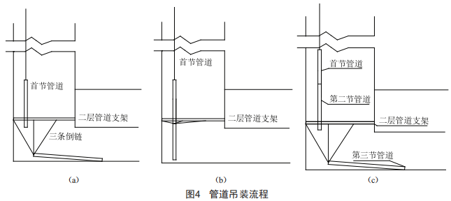 第一根管道停止擺動后,進行第二根管道的起吊,第二根管的吊裝采用設(shè)置在上一樓層的三個葫蘆倒鏈進行。利用三個倒鏈將管道調(diào)整到上一段管道的正下方,保持豎直狀態(tài)。上一段管道緩慢下落與第二根管道進行對接(圖4)。到位后,若錯變量大,則調(diào)整倒鏈長度,調(diào)整時需保持管道豎直狀態(tài)。