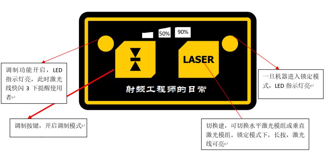 4. 按鍵板其中的切換鍵可以控制切換水平激光模組或垂直激光模組,調(diào)制按鍵可以開啟調(diào)制模式;按鍵控制板上會有2個按鍵,2個LED指示燈及3檔電量顯示;