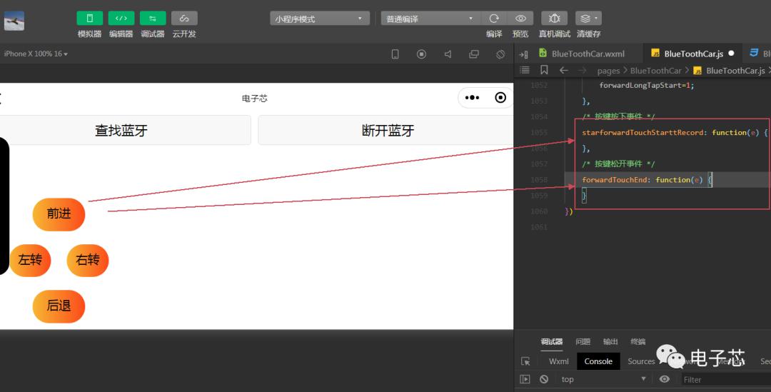 接下來需要完成按鈕的事件操作,本來想用按鈕長按才進行數(shù)據發(fā)送,但是長按的識別事件并不會一直觸發(fā)這個事件,在一次長按操作下只會觸發(fā)一次,所以并不能一直觸發(fā)進行發(fā)送數(shù)據。因此使用了按鈕按下和按鈕松開事件觸發(fā)操作。在按鈕按下后置位一個標志位,進行數(shù)據發(fā)送,這個數(shù)據需要一直發(fā),讓小車一直進行行駛。只有松開按鈕后才會停止。下圖是針對前進按鈕的按下和松開的時間操作函數(shù)。