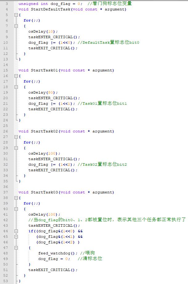 假設(shè)系統(tǒng)中有4個任務(wù),DefaultTask、Task01、Task02、Task03。我們先建立一個全局變量dog_flag用于存儲各個任務(wù)的喂狗狀態(tài);在前3個任務(wù)的主循環(huán)中,把dog_flag對應(yīng)的bit位置位,DefaultTask置位bit0、Task01置位bit1、Task02置位bit2;在最后的Task03任務(wù)中,循環(huán)檢查是否所有在使用的bit位都被置位,如果都被置位,則說明其他所有的任務(wù)的主循環(huán)都在正常運(yùn)行,那么可以喂狗;同時最后要將dog_flag清零,以用于下一次監(jiān)測置位。