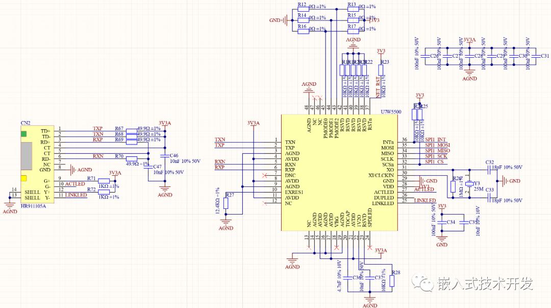 網(wǎng)口可以使用帶網(wǎng)絡變壓器的接口,或者網(wǎng)絡變壓器和接口獨立的,都可以,這里使用的HR911105A是帶網(wǎng)絡變壓器的。、