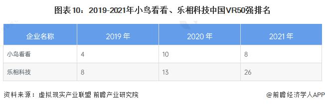 自2019年起,受世界VR產(chǎn)業(yè)大會承辦機(jī)構(gòu)委托,虛擬現(xiàn)實(shí)產(chǎn)業(yè)聯(lián)盟組織開展了“中國VR50強(qiáng)企業(yè)”評審工作,至今以連續(xù)發(fā)布三年,從名次上來看,小鳥看看的排名在2020年下降至第10名,并于2021年上升至第8名,整體保持在前10名;樂相科技的名次出現(xiàn)連續(xù)兩年下滑,2021年其排名下降至26名。