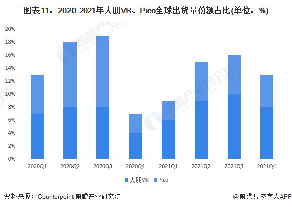 從兩家企業(yè)的全球出貨量市場份額來看,大朋VR的全球出貨量份額自2020年第四季度就一直高于Pico全球出貨量份額,2021年第四季度大朋VR的出貨量份額為8%,Pico的出貨量份額為5%。