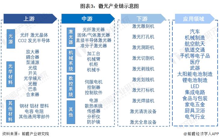 歷經(jīng)多年的發(fā)展,激光技術(shù)已廣泛應(yīng)用于各行各業(yè),形成了完整的產(chǎn)業(yè)鏈。激光產(chǎn)業(yè)鏈上游主要包括光源材料、光學(xué)元器件及其他組成激光器的材料;中游主要為各種激光器、機(jī)械系統(tǒng)、數(shù)控系統(tǒng),其他例如電源、散熱器、傳感器、分析儀、防護(hù)鏡等;下游則是成套的激光加工設(shè)備,如激光切割機(jī)、激光焊接設(shè)備、激光打標(biāo)機(jī)等。激光產(chǎn)業(yè)鏈的終端應(yīng)用領(lǐng)域涉及交通、醫(yī)療、電池、家電、商業(yè)用途等。