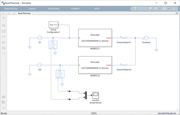 為了構(gòu)建這個(gè)“純”熱模型,我們先對(duì)已導(dǎo)入的英飛凌SPICE子電路進(jìn)行編輯,只留下Cauer網(wǎng)絡(luò)。兩個(gè)Cauer網(wǎng)絡(luò)的輸入是兩個(gè)恒定熱流源Q1和Q2,代表每個(gè)PWM周期的平均結(jié)熱流。這個(gè)“純”熱模型可以運(yùn)行到穩(wěn)態(tài),或使用Simscape,從穩(wěn)態(tài)選項(xiàng)啟動(dòng)。不論哪種方式,與其他方式相比,它們求解Cauer網(wǎng)絡(luò)節(jié)點(diǎn)溫度的時(shí)間都是可以忽略不計(jì)的。