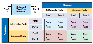 到目前為止,為單端器件的典型示例定義了S參數(shù),其中刺激和響應(yīng)信號(hào)均以地為基準(zhǔn)。但是,對(duì)于具有差分端口的平衡器件,此定義還不夠。平衡網(wǎng)絡(luò)需要更廣泛的表征方法,它必須能夠充分描述其差分模式和共模響應(yīng)。這可以利用混合模式S參數(shù)來實(shí)現(xiàn)。圖2顯示了混合模式散射參數(shù)的一個(gè)例子,這些參數(shù)組成一個(gè)擴(kuò)展S矩陣,代表一個(gè)典型的雙端口平衡器件。