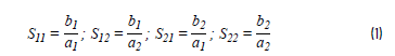 示意圖圖1顯示的波量a是入射在器件端口1和端口2上的電壓波的復(fù)數(shù)幅度。如果使用相應(yīng)的波量a1或a2依次刺激一個(gè)端口,同時(shí)另一個(gè)端口端接到匹配的負(fù)載中,我們就可以根據(jù)波量b來定義器件的正向和反向響應(yīng)。這些數(shù)量代表了從網(wǎng)絡(luò)端口反射和通過網(wǎng)絡(luò)端口透射的電壓波?;谒脧?fù)數(shù)響應(yīng)和初始刺激量的比率,我們可以定義雙端口器件的S參數(shù),如式1所示: