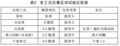 通過脫硫石膏水分試驗,脫硫石膏游離水分控制在了9%左右。就現(xiàn)有的原料,在工藝選擇上,漳電技術(shù)人員又做了多種工況試驗。通過干濕參比及雙加密、雙壓球等各種試驗得出,經(jīng)雙壓球后,能夠不粘模且全脫模,石膏球的強度也大,不容易破碎,試驗效果較好,再經(jīng)晾曬,符合水泥生產(chǎn)廠家的要求。試驗情況如表2所示。